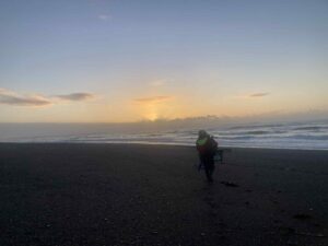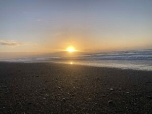 The ocean, however, had other ideas. A huge, rolling swell marched in and as the sun rose higher, we could clearly see that the water was brown. Not the clear, crisp surf we had imagined. This beach wasn’t ideal for lures so we fished the last of the ebb tide with our beachcasters, armed with peeler crab and sand eel. Nothing, time to move.