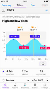 Our strategy was built on tides. We aimed for a spring tide, the big powerful surges that occur when the sun and moon align, creating a stronger gravitational pull. This means a greater difference between high and low water, more current, and (in theory) more active fish stirred from their slumber. A neap tide, with the sun and moon at right angles, is a gentler, weaker affair, often resulting in quieter fishing.