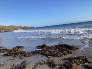 Undeterred, we headed to the car and with our gear still on us drove 10 km to our next mark. A stunning, secluded cove. Picture-perfect, but the swell was even greater. We switched to spinning rods, casting soft plastic sand eels, savage sandeels, and the ever-reliable, Pachenko along the rocks. Then came the seaweed. At first, it was a minor annoyance, clinging to our lure. But as the tide rose, the weed rose with it. Thick, blanket-like rafts of the stuff. We spent more time picking weed off our lines than fishing. The final straw was when I thought I had a bass which turned out to be several kilos of kelp racing in the tide, some struggle to land that!.